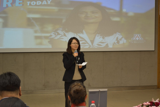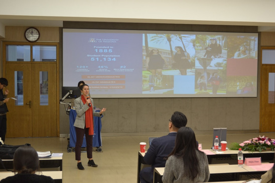 亚利桑那大学国际录取招生主任Katie Van Wyk重点介绍了学校。亚利桑那大学师资力量雄厚,在校教师曾5次获得诺贝尔奖、153次评为美国国家院士和美国科学院院士,目前,在校生超过5万名,有来自世界各地的留学生,在读的中国留学生超过800名,亚利桑那大学对于国际学生给予众多的支持和关怀,会为留学生安排专门的学习导师,帮助其快速适应英语教学环境和美国学习。生活方面,亚利桑那大学位于美国亚利桑那州图森市,该地气候适宜,空气质量良好,全年有超过300天是晴天,冬季平均气温在18-24℃,非常宜居,另外,图森市也是美食之城,有很多华人超市,可以满足留学生的生活之需。
