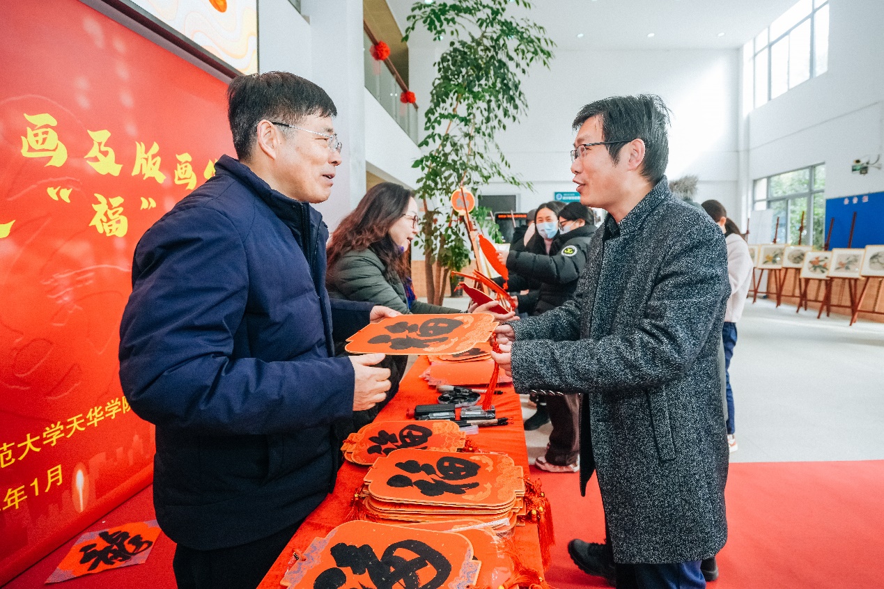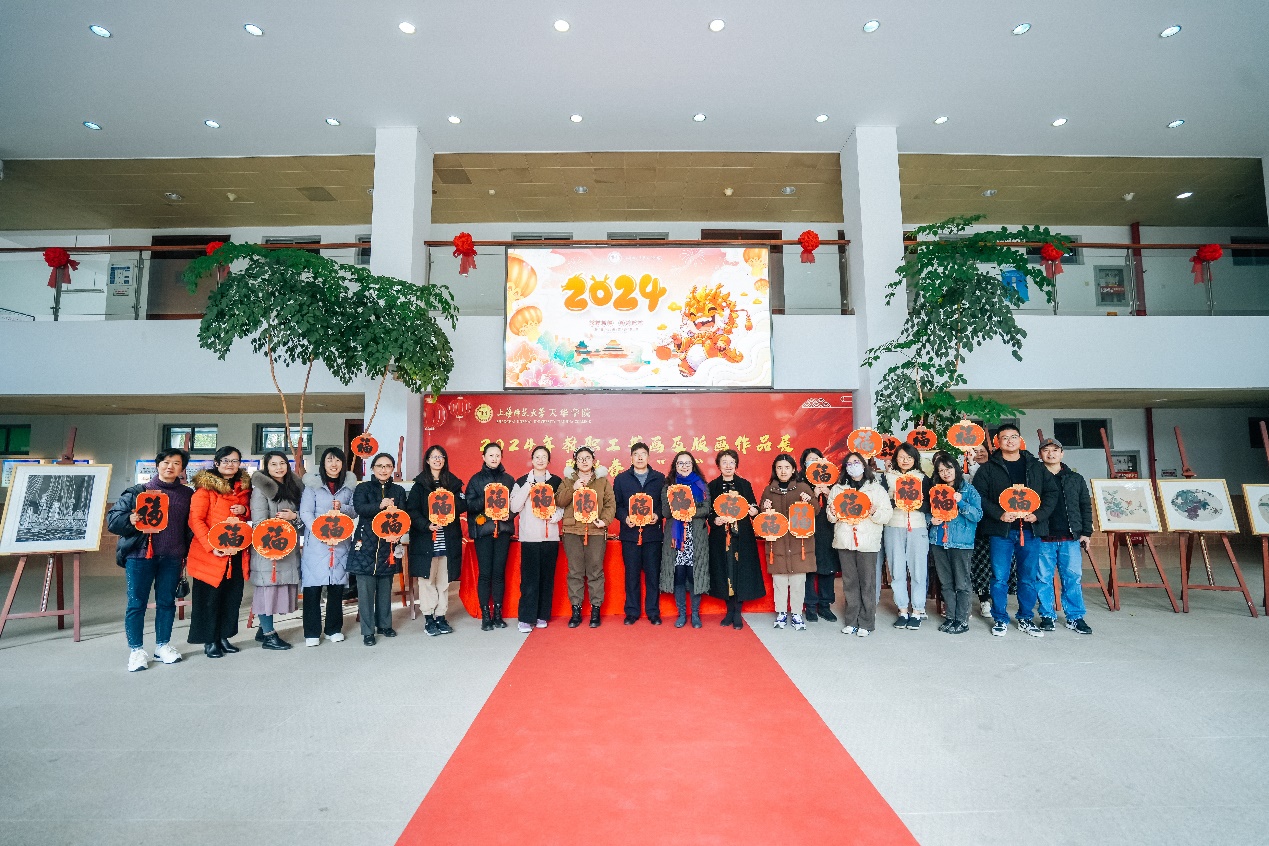 1月8日中午,我校工会于明华楼大厅组织开展教职工书画及版画作品展暨新春送福活动,旨在丰富教职工的业余生活,展示教职工的艺术风采,同时也为即将到来的新春佳节营造浓厚的喜庆气氛。副校长、工会主席吴国兴,副校长龚春蕾,工会常务副主席曹卫等领导莅临活动现场,为广大教师送去新春的问候和祝福。