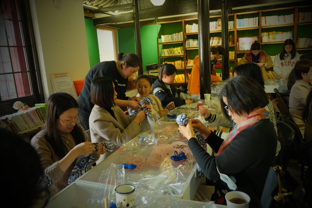 3月15日下午,学校工会携手关工委,邀请学校老专家及师生代表在浦东新区惠南有风小院举办了一场别开生面的乡村风情体验活动——制作艾草养生锤,共同感受乡村的宁静与美好。抵达小院,大家便被热情好客的工作人员迎进屋内,品尝着特色塌饼与各式美食,细听其烹饪秘诀。塌饼的香醇滋味,令人回味无穷。随后,一行人移步手作室,开始艾草养生锤的制作之旅。工作人员耐心指导,大家将艾叶置于纱布中央,剔除梗部,细心包裹并反复按压,直至形成圆润紧实的形状。撒入决明子,插入木棒,最后用扎染布与绳子固定手柄。