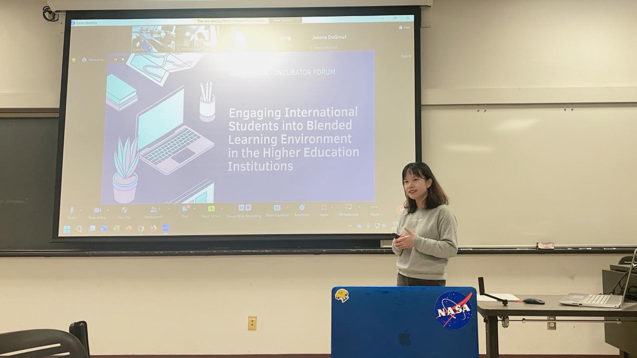 在学习过程中,他们刻苦钻研,认真完成作业,积极参与多项课程活动。在EPS635社会公平正义及多样性课程中,陈笑老师比较了解中美两国学生的学术文化差异,并结合中国学生在美学习体验的反馈,向美国学生展示了中国高校教育国际化的进程;在ECI761课程高阶研讨课程中,夏智源老师以课程与教学基本原理、学校课程改革为主题,以文章为导入,与美国同学探讨中国的课程评价体系、文化沉浸、文化自信、艺术教育等话题;在EPS726教育统计课程中,张宁老师以1篇学术文章为例,分享了定量研究中调节中介研究方法的使用;在EPS609认知与情感课程中,叶彬恩老师分享了有关知识与认知:概念、概念变化和动机推理的见解;在ECI710学校教育背景课程中,闫婷老师以一篇文献为切入点,和大家共同探讨建构主义,技术接受模型(TAM), 研究方法等问题,并分享了中国学生使用数字媒体和平台进行合作学习的情况;在TSM621学习的理论视角课程中,叶彬恩老师与张宁老师以信息加工视角如何解释思维和学习为题,与大家分享了在教学中这一学习理论的应用情况。