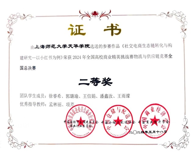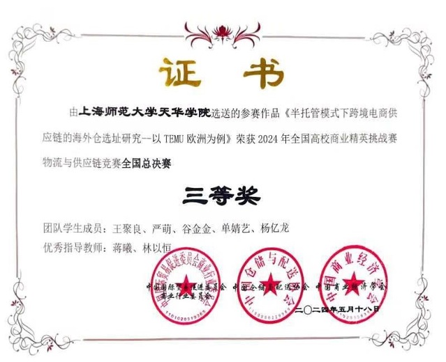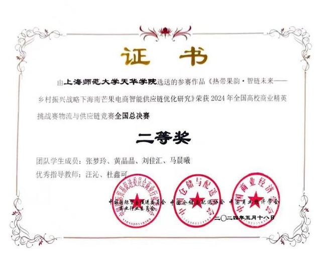 2024高校商业精英挑战赛物流与供应链竞赛总决赛于2024年05月18日成功举办。在此次竞赛中,由项芹、孟林丽、汪沁、杜鑫可、蒋曦、林以恒六位老师指导的商学院物流管理专业的的三支参赛团队,包括由徐睿希、郭璐瑜、王信娟、潘鑫汝、王雨濛组成的“随机应队”,由张梦玲、黄晶晶、刘佳汇、马晨曦组成的“逐梦、无惧”团队和王聚良、严萌、谷金金、单婧艺、杨亿龙组成的“出海小纵队”,在全国300余支参赛队伍中脱颖而出,获得了两个二等奖和一个三等奖的好成绩,并有14名同学在参与竞赛的过程中获得了《仓储从业人员职业资质》和《物流服务师》的资格认证。