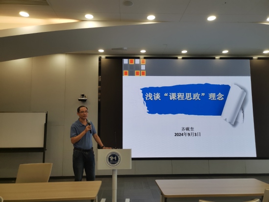 接下来,宣传部长齐砚奎老师开展主题讲座《浅谈“课程思政”理念》,从思政课程到课程思政的角度,向新老师介绍了将思想政治教育融入高校课程教学的过程。思想政治教育,利用好课堂教学过程能够对学生的思想品德、行为规范,乃至人生观、价值观起到重要影响。齐部长鼓励新教师们,不仅要教好专业知识,更要通过教学过程反思个人的一言一行,首先从提升教师自我的思想政治素养开始,言传身教,担当学生的榜样楷模,成为学生灵魂的塑造者。
