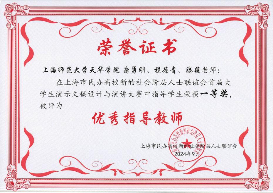 此外,裔勇刚、程葆青、滕薇三位老师在本次大赛中指导学生荣获一等奖,被评为优秀指导教师。他们的辛勤付出和专业指导为学生的成功奠定了坚实的基础。