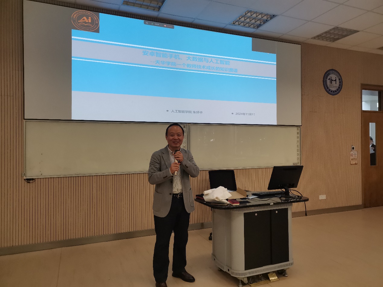 接下来,朱怀中老师与大家做分享。结合自己在天华学院的竞赛教学和科研经历向大家报告了一个教师技术成长的过程,并解释了知识图谱的概念是一种半结构化数据的表示方式,朱怀中老师叙述了2011年2月进入天华后,从拿教师资格证以及指导学生参加教育部组织的安卓智能手机团体赛,并获团体一等奖,在电子科技期刊上发表安卓智能手机文章《基于安卓的手机ocr识别技术设计与实现》评讲师职称,以及在同济大学大数据的研究与获得博士学位,还有近几年的人工智能的研究与教授职称的评定。阐述了竞赛、教学和科研三者相辅相成的统一,并介绍了开发竞赛作品与毕业设计论文的指导以及注册专利和软著与发表文章的模式。朱怀中老师以自己的经历说明天华的平台是培养人才的平台,要想多出成果,就要及时把握技术动态,保持技术先进性,同时要乐于助人,勤奋努力,多出成果,才会取得进步。