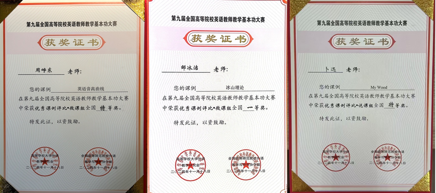 2024年11月18日,全国高等院校英语教学学术年会暨第九届全国高等院校英语教师教学基本功大赛在江城武汉圆满落幕。初等教育学院三位教师在本次比赛中共斩获国家级特等奖两项、一等奖一项,所获奖项含金量再创新高。其中微课组周峥东老师获得国家级特等奖、邹冰洁老师获国家级一等奖;说课组卜迅老师获得省赛特等奖后晋级国赛,在国赛中斩获特等奖。