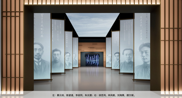 序厅展陈选取美育历史上举足轻重的八位人物,以玻璃雕刻艺术手法,对蔡元培、陈望道、李叔同、朱光潜、徐悲鸿等名家形象进行立体艺术化塑造。