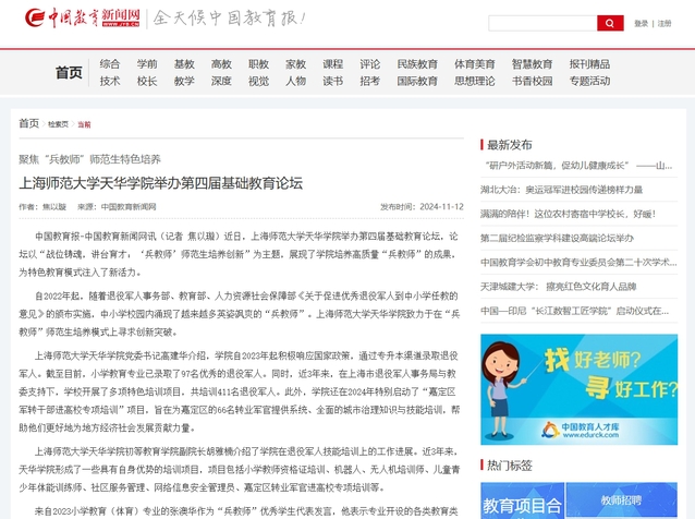 中国教育报-中国教育新闻网讯(记者 焦以璇)近日,老版新葡萄8883国际官网举办第四届基础教育论坛,论坛以“战位铸魂,讲台育才:‘兵教师’师范生培养创新”为主题,展现了学院培养高质量“兵教师”的成果,为特色教育模式注入了新活力。