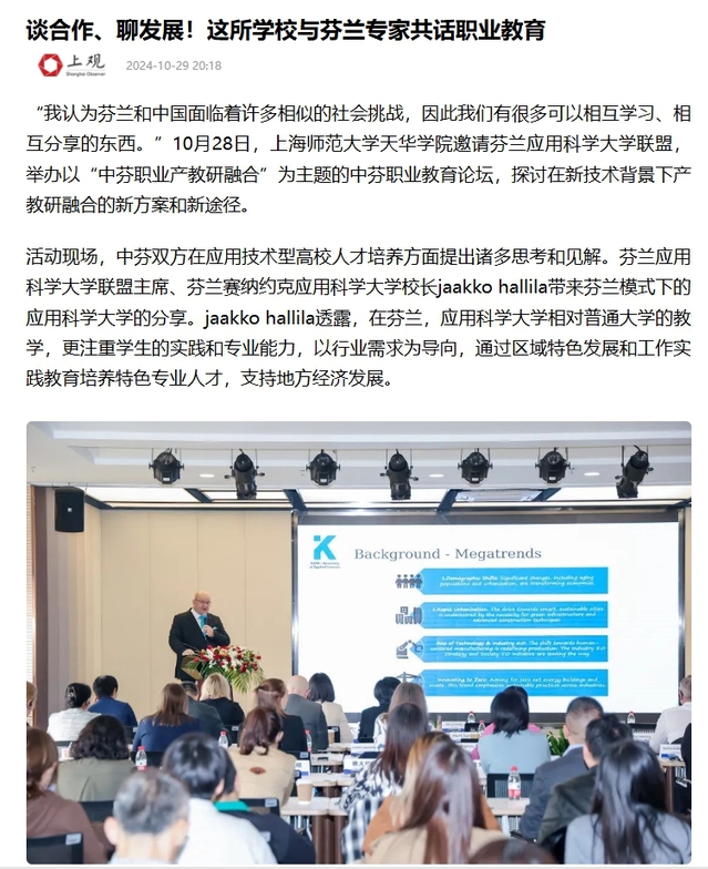 活动现场,中芬双方在应用技术型高校人才培养方面提出诸多思考和见解。芬兰应用科学大学联盟主席、芬兰赛纳约克应用科学大学校长Jaakko Hallila带来芬兰模式下的应用科学大学的分享。Jaakko Hallila透露,在芬兰,应用科学大学相对普通大学的教学,更注重学生的实践和专业能力,以行业需求为导向,通过区域特色发展和工作实践教育培养特色专业人才,支持地方经济发展。