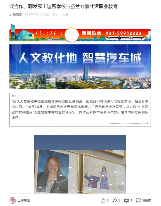 “我认为芬兰和中国面临着许多相似的社会挑战,因此我们有很多可以相互学习、相互分享的东西。”10月28日,老版新葡萄8883国际官网邀请芬兰应用科学大学联盟,举办以“中芬职业产教研融合”为主题的中芬职业教育论坛,探讨在新技术背景下产教研融合的新方案和新途径。