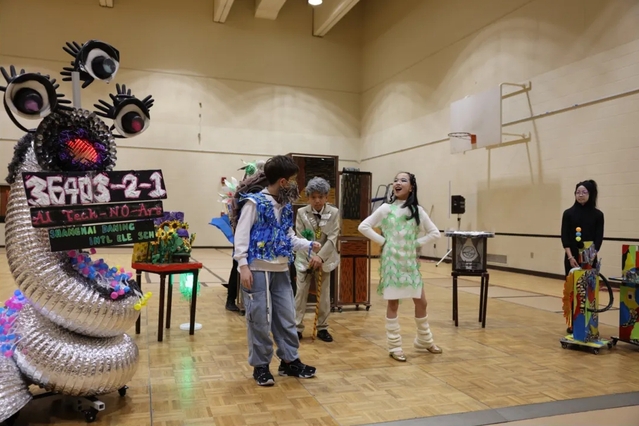 在“人工智能装置”题目比赛中,上海市大宁国际小学在情节设计上,利用装置穿越回过去和梵高相遇,实现未来和过去的对话,共同探讨艺术的本质。