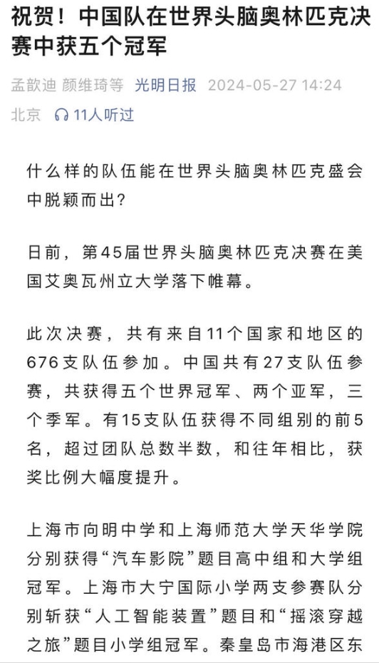 光明日报 | 祝贺!中国队在世界头脑奥林匹克决赛中获五个冠军