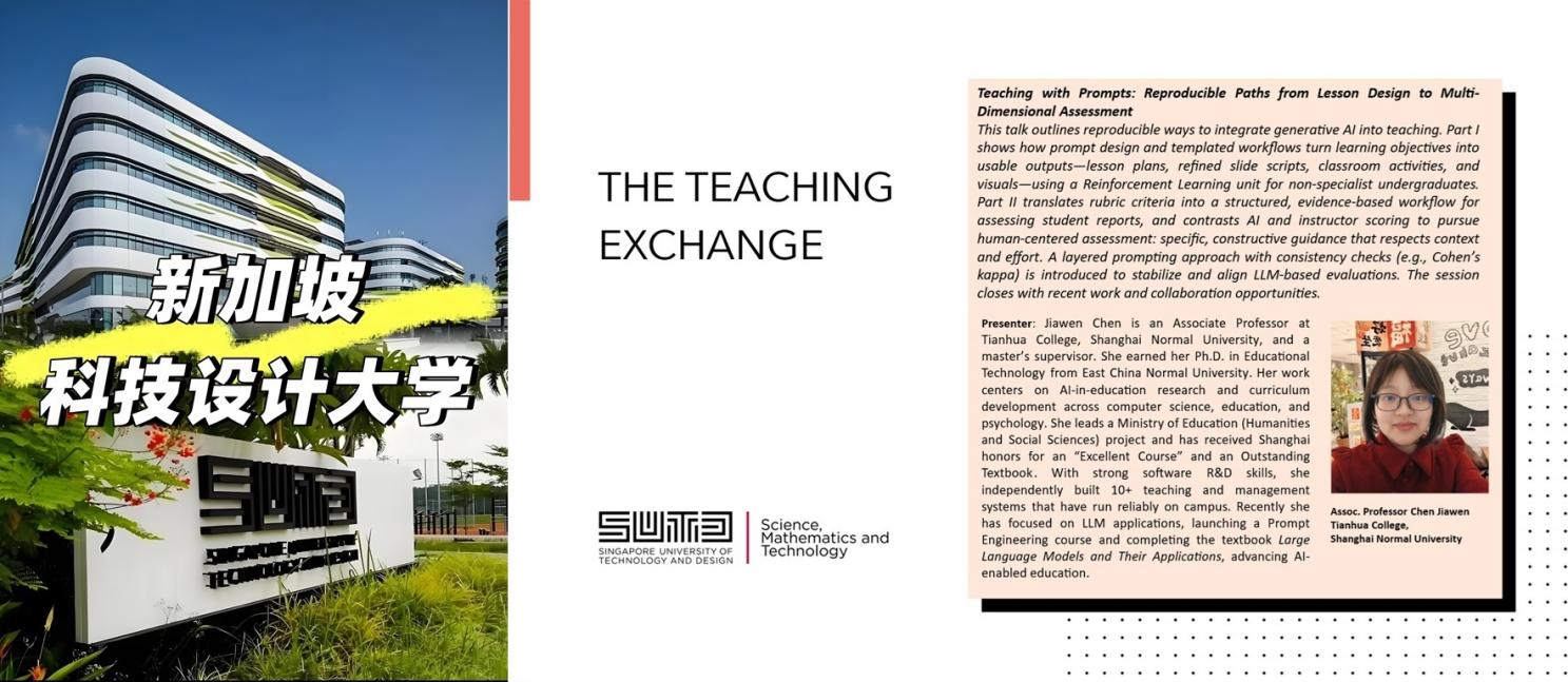 随着2025年8月19日专题讲座的顺利举行,人工智能学院教师陈佳雯在新加坡科技设计大学(Singapore University of Technology and Design, SUTD的访学也接近尾声。她受邀作题为“Teaching with Prompts: Reproducible Paths from Lesson Design to Multi-Dimensional Assessment”的报告,围绕生成式人工智能在教育中的应用展开,系统介绍了如何通过提示词和模版化流程,将学习目标转化为可操作的课程设计与多维度评价体系,并提出引入一致性检验以提升AI辅助评分的稳定性和可靠性。讲座激发了师生们的兴趣与共鸣,并引发了关于未来教育模式的深入讨论。