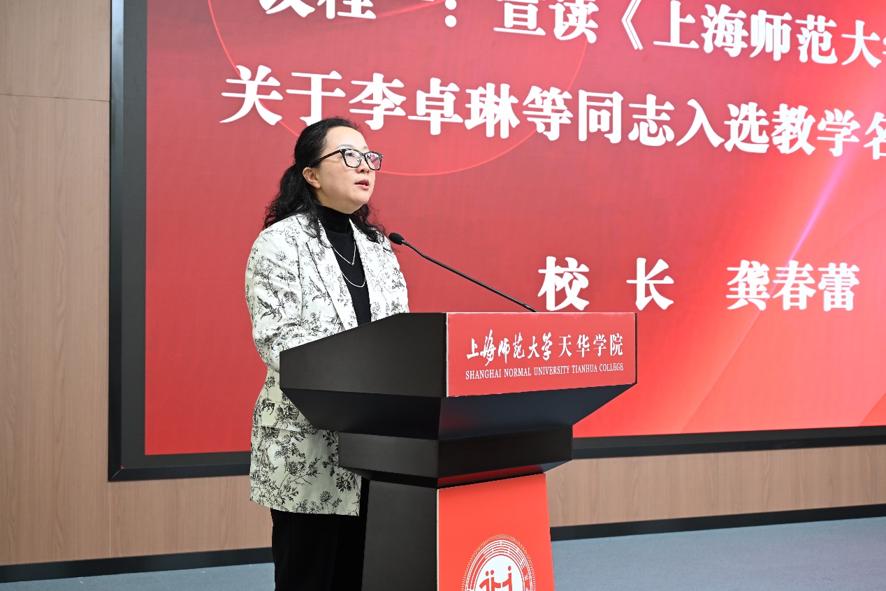 会议伊始,滕薇向获评教学名师的老师们表示衷心祝贺。随后,校长龚春蕾宣读《老版新葡萄8883国际官网关于李卓琳等同志入选教学名师的决定》。本轮评选共产生111名教学名师,其中预备级60名、三级30名、二级20名、一级1名。龚校长邀请每位获评名师起立亮相,全场报以热烈掌声,现场气氛欢愉而温馨。