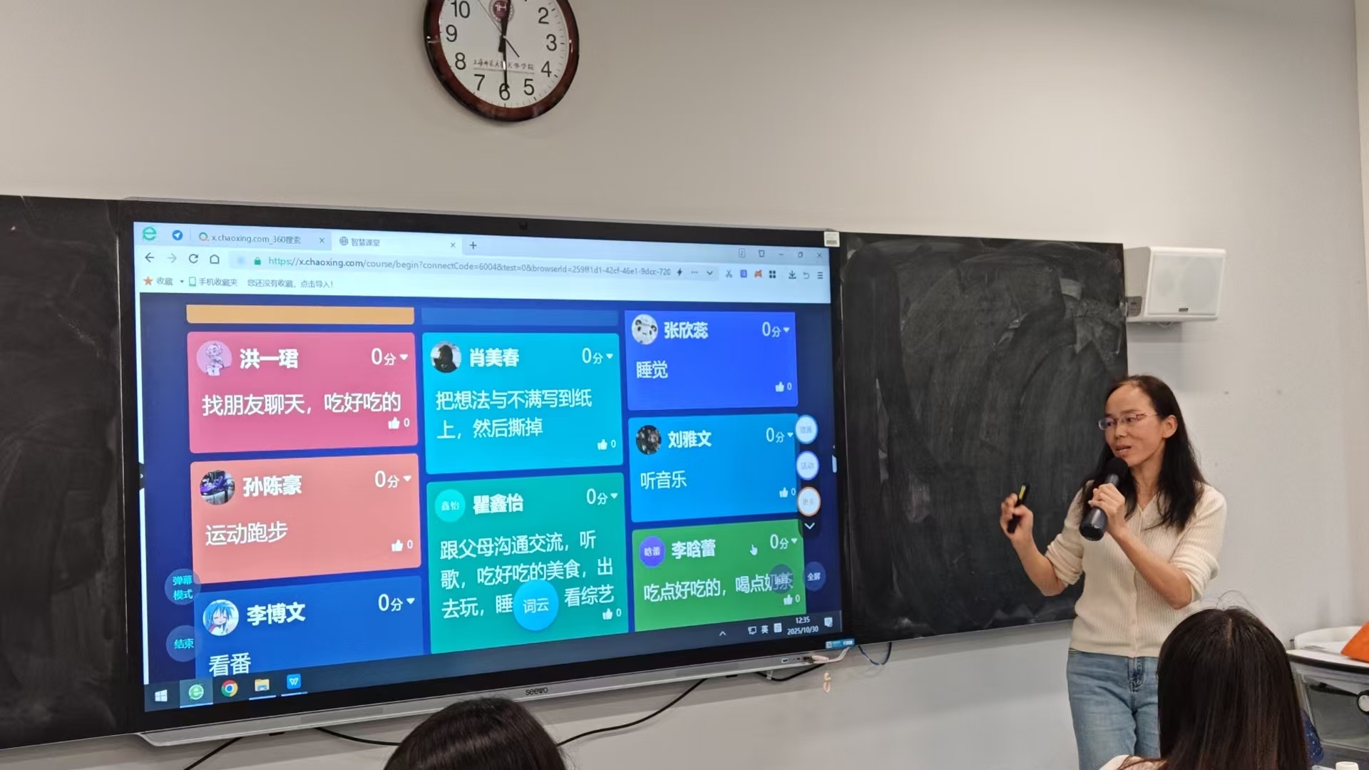 《我的阿勒泰》片段对比,女主角从“平静—羞涩—震惊—暴怒”的表情变化被金老师逐帧拆解。“觉察,是改变的第一步。”她现场示范“情绪温度计”:0-10分打分,先定位,再降温。让大家现场讨论自己以后在面对负面情绪时,会采用什么策略,并采用投屏的形式分享给同学们。