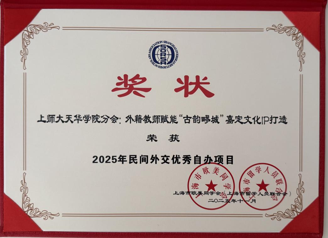 该项目获学校官媒、上海嘉定官媒、嘉定融媒体、上海日报(英文版)、Shanghai Daily(海外版)及澎湃新闻等20余家海内外主流媒体聚焦报道,多名外教亦通过个人自媒体平台广泛传播。在上海市欧美同学会101家分支机构提交参评的众多民间外交项目中,该项目以显著成效脱颖而出,荣膺2025年民间外交优秀自办项目奖。此为分会连续第二年蝉联该奖项,充分彰显天华学院在教育国际化创新实践及外籍教师管理领域的卓越贡献。