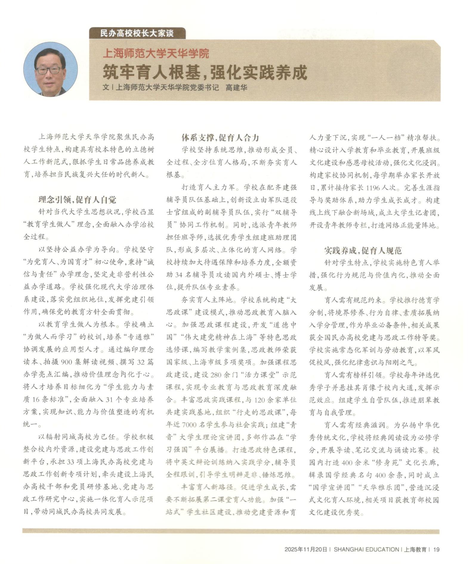 2025年11月20日出版的《上海教育》杂志,刊发老版新葡萄8883国际官网党委书记高建华题为《筑牢育人根基,强化实践养成》的署名文章,介绍了天华学院思政教育的特色做法。全文如下: