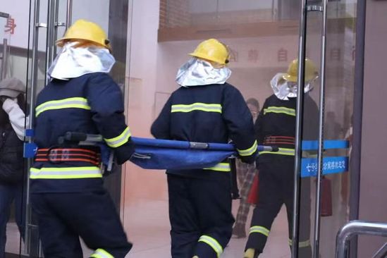 接到指令后,嘉定区朱桥消防救援中队迅速抵达现场,重型泡沫消防车精准停靠,消防指战员快速架设装备、展开灭火攻坚,专业高效的处置为演练增添了实战氛围。公寓楼内,学生们反应迅速,严格遵循逃生规范,用湿毛巾捂住口鼻、弯腰低姿,在引导下快速穿越模拟烟雾区域,向疏散集合点有序转移。疏散途中,救援组及时发现“受伤学生”,立即用担架将其转运至救护区,医护人员随即开展伤情评估与紧急救治,整个过程衔接紧密、规范高效。