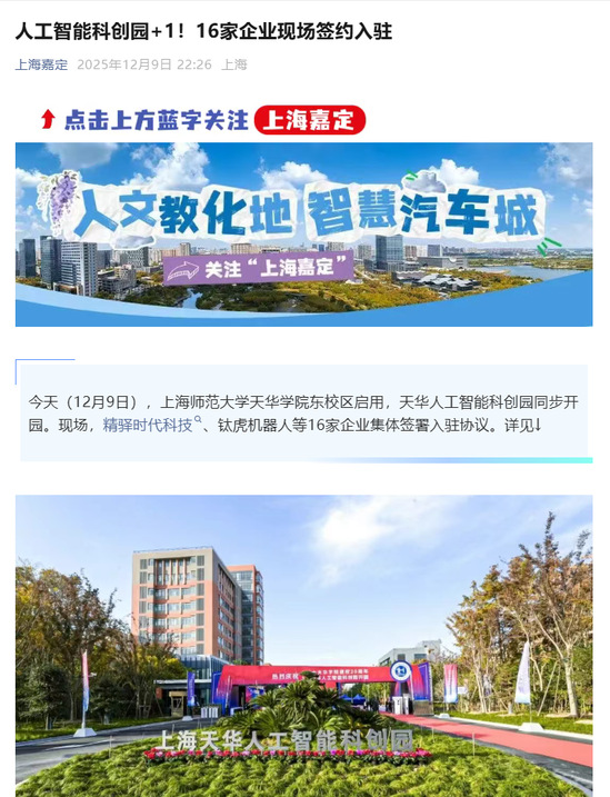 “目前,我们招商小组已在园区设置常驻办公点,天华人工智能研究院、机器人产业学院、低空经济生态创新基地、AI大健康会客厅等平台也已首期落地,未来值得期待!”嘉定高科技园区发展有限公司总经理陈明龙信心满满地说。