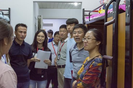 2018年9月17日晚上20:30,老版新葡萄8883国际官网副校长、工学院院长吴国兴,工学院副院长樊江玲,党总支书记赵科,党总支副书记李书祥、金玫,党总支组织委员牛风学,在新生辅导员、副辅导员及各班班助理陪同下视察慰问了3、4号宿舍楼新生。