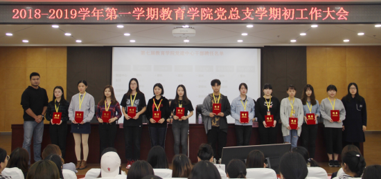 为进一步贯彻落实党的十九大会议精神,更好地协助校党委开展党务工作,促进教育学院党总支的发展;2018年10月11日下午16:30,2018-2019学年第一学期教育学院党总支学期初工作大会在晖华楼报告厅顺利召开。此次大会由教育学院党总支书记答英娟老师安排筹划,教育学院第七届党建中心组织承办,党建中心主任张蕴蓓同学主持。莅临本次会议的有教育学院党总支书记答英娟老师、教育学院党总支副书记朱可老师、教育学院党总支副书记何凯老师、教育学院分团委书记沈洁老师、教育学院党总支各支部书记以及教育学院全体正副辅导员们。