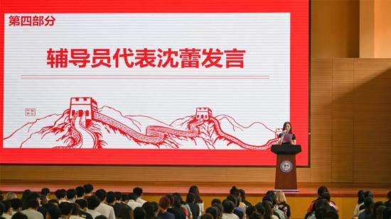 最后,辅导员代表沈蕾上台总结发言,她以辅导员的身份给在座的新生们提出了几点建议:首先对自己的未来发展要有清晰的规划和目标,要脚踏实地一步步走向成功;不断提升不断学习,竭尽全力充实自我,做一个“专通雅”全面发展的天华学子;同时要有严格的自律精神,养成良好的行为习惯和精神意志;最后应该要培养自己的集体主义精神,积极融入校园生活,开拓视野,挖掘潜能,全面提升自己的综合能力。希望所有的新生都可以把自己培养成为有社会担当和健全人格、有专业才能和创新精神的天华人。