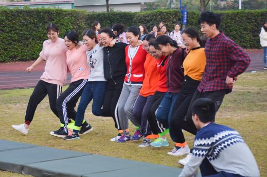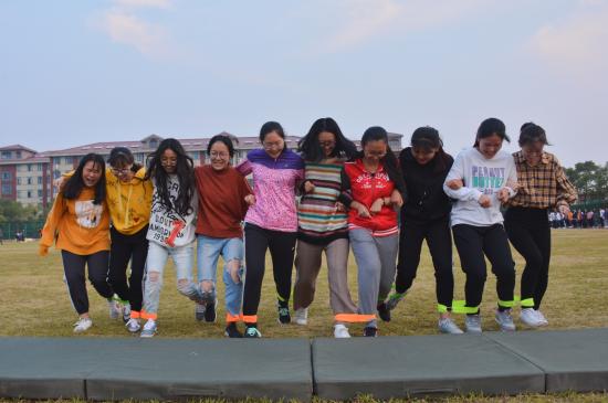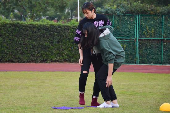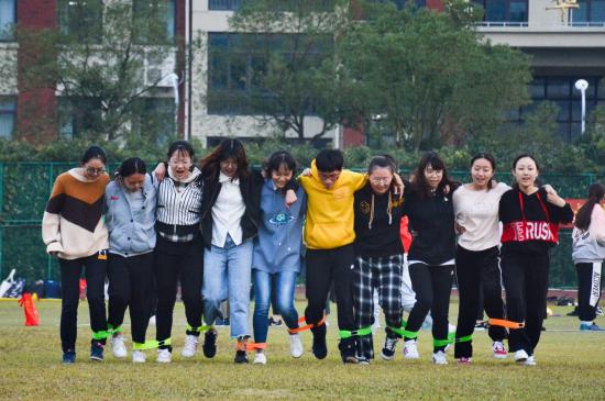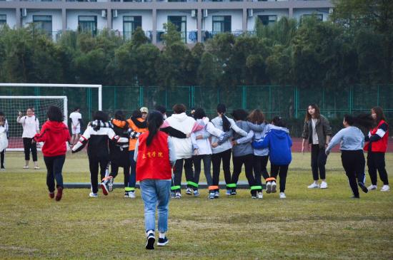 最后一个环节就是本次活动的重头戏“十人十一脚”,选手们在绑完绑带之后,鼓起了斗志、喊起了响亮的口号,向着终点,向着胜利前进。尽管在比赛中出现了摔倒或是掉队的情况,但是没有一个班级在中途放弃,大家在相互鼓励下,一起迈向终点。