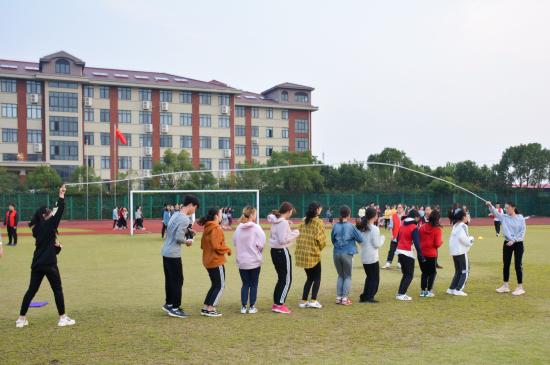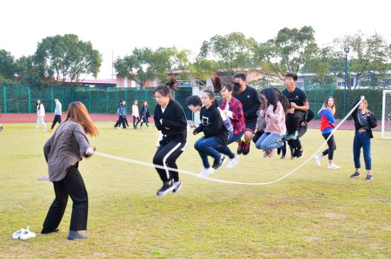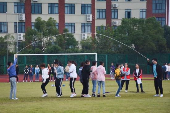 第二环节“跳长绳”看似是一个非常简单的项目,但却是本次活动中最具有挑战性和最体现班级默契度的关卡。一个班级的十位参赛者需要在互相配合之下一起完成十次跳绳。绳子在他们的手中像彩环似的飞舞起来,发出了“啪、啪……”的响声,选手的斗志也随着这一阵阵响声被激起。