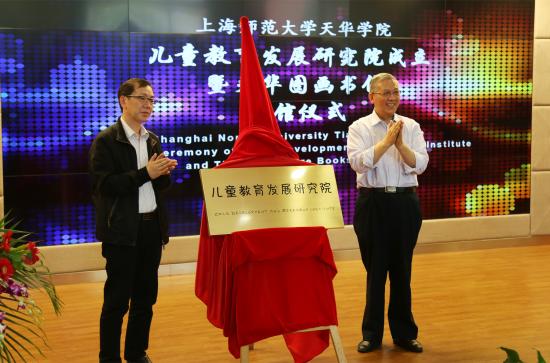 (上海市教委高教处傅建勤处长,学校董事长邹荣祥为儿童教育发展研究院揭牌)