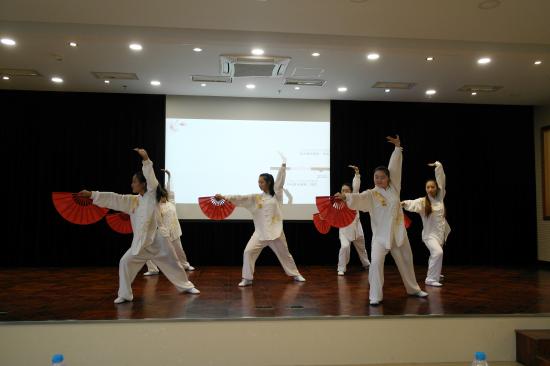 交流会的第一项成果展示是来之通识学院的开场表演《功夫扇》。功夫扇,摄取中华武术精华,把武术动作和扇术共熔一炉,刚柔并济、飘逸潇洒,是一种极具观赏性和艺术性的健身运动。自2010年功夫扇走进天华学院,七年来,校功夫扇队在上海市武术拳操功夫扇比赛中斩获无数奖项,迄今为止共获得四次一等奖、四次二等奖。