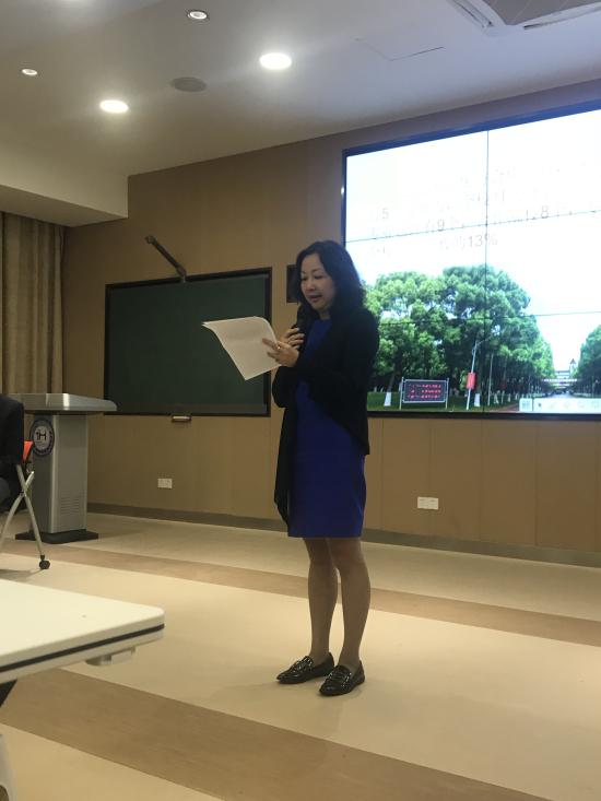 副校长龚春蕾致欢迎辞,对美方一行领导和嘉宾表示欢迎与感谢,并与在场学生分享两校之间的深厚情谊,三年来双方领导、老师多次互访,尤其,本学期访学的专业主任刘敏老师,在协和大学受到了热情款待,学习与生活方面都得到许多帮助与收获。龚校长展示学校的国际化及合作项目的成果,五年中,全校开展的中外合作办学和国际课程合作的专业已有9个,合作院校8个,专业学生规模1245,占到全校总人数的13%。而在这些合作院校中,协和大学的教学投入和认真负责的程度最让人钦佩,全方位关注每一位项目内的同学语言能力和专业能力提高。最后,龚校长对同学和合作项目做出了美好的展望与期许。