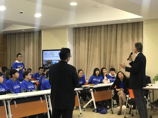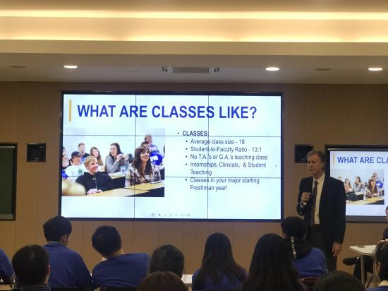 威斯康星协和大学助理副校长David Birner介绍了协和大学的历史以及发展概况,并向同学展示了协和大学优良的教学环境和人文环境。同时,他详细介绍今后学习过程中,外教来沪授课、学生赴美学习的详细安排。憧憬学生们将社团活动带到协和大学,增加两国两校间的文化交流与理解。