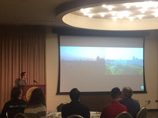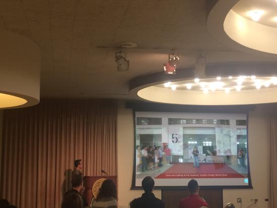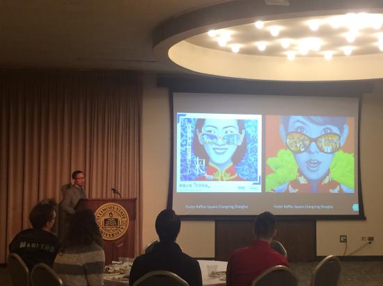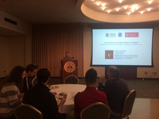 美国时间10月26日,正在美国伊利诺伊州立大学访学的艺术设计学院钟华勇老师,在“国际教育周”活动中,在Bone Student Center学生活动中心开展了一场有趣的视觉化的公开演讲,讲座题为《相比芝加哥,上海设计师的生存现状及设计趋势和风格》。来自伊利诺伊州立大学视觉设计学院的不同设计领域的20余名专业师生参与了讲座,包括来自6个国家的国际师生。戏剧舞蹈专业的专业主任Janet Wilson教授,学院办公室的Janet Tully教授,国际办公室Richael老师出席了讲座。