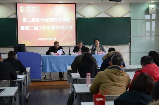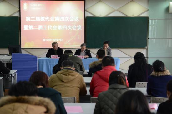 12月27下午,学校工会在明华楼演播中心召开了第二届教代会第四次会议暨第二届工代会第四次会议。会议主要议题为:听取学校工作报告,审议行政教辅人员重点性调资方案。教代会代表共52人出席了会议,会议由党委副书记、工会主席许岳主持。