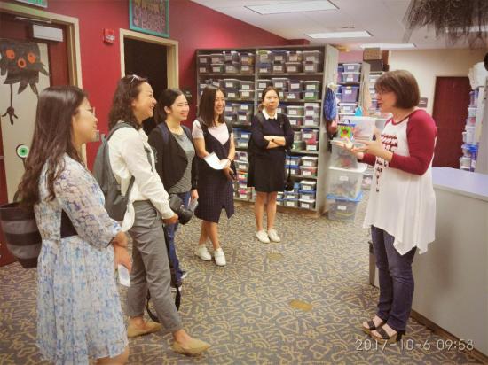 来到University Place小学, 得到了副校长Mr.Brian的热情接待,他周到地专程安排在学校就读的二位中国小朋友担任学生大使,全程陪同我们参观。据Brian介绍,学校在2011年的飓风袭击中损失惨重,目前的校舍都是各界爱心人士捐款重建而来。该所学校的生源大部分来自贫困家庭,有50%以上的学生享受政府补助的免费午餐。学校图书馆为学生提供免费图书,可借阅或免费索取。学校重视学生七种习惯——积极主动、以终为始、要事第一、双赢思维、知彼知己、统合综效、不断更新——的培养;以STEAM为特色,强调各门课程联动的STEAM教学。Brian和两位可爱的中国小向导带我们进入各年级教室进行课堂观察,观摩了五年级科学课、数学课和学前班拼读课。我们发现,日常教学中老师们非常注重挖掘学生主动思考和建构知识的能力,课堂中融入了大量的实践操作。小朋友们不需要机械的记忆课本知识,而是在探究性的学习环境中获得知识。