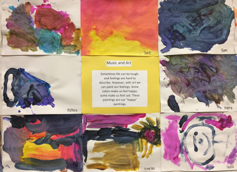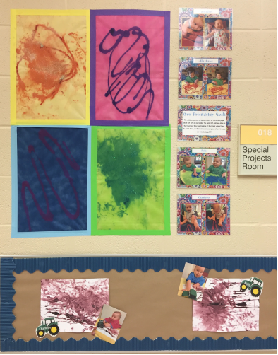 第三,艺术作品展示体现研究型机构的特质。UA附属幼儿园每两周就会更换一次走廊里的幼儿作品,进行美术教学活动展示。每类作品都会附上说明,使观看的老师、同学、研究人员、家长都可以清晰地了解作画的步骤、材料、过程和结果,这正是研究型幼儿园特质的体现——研究美术作品,解读幼儿心灵。通过三个月的观察,访学团成员发现,UA附属幼儿园以创意美劳课为主,把绘画和手工相结合,强调孩子的动手体验,鼓励表现。内容结合节日、文化、生活、情感,从艺术语言的基本元素开始美术学习,内容包含创意拼贴、盖印画、立体彩绘、生活艺术创作等。从展示的作品中可以看出,幼儿园注重生活化美术材料的使用,材料非常丰富,包括水果、蔬菜、面粉、吸管、纸碟、泡泡、亮片、锡纸、泡沫袋、积木、棉棒等;并且重视幼儿之间的合作,关注跨领域研究,让幼儿在学中玩,玩中学,感受学习和探索的乐趣,从而学会热爱生活、赞美生活。