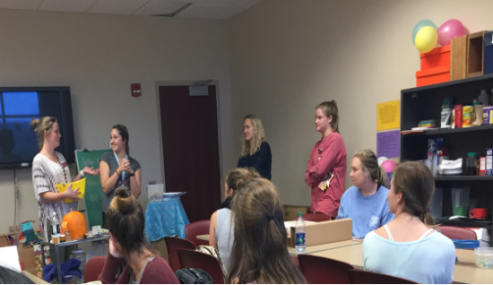 (幼儿园教师团走进大学课堂展示幼儿科学教育材料。前排左起:幼儿主班教师、副班教师、大学教授、幼儿园长期实习生)