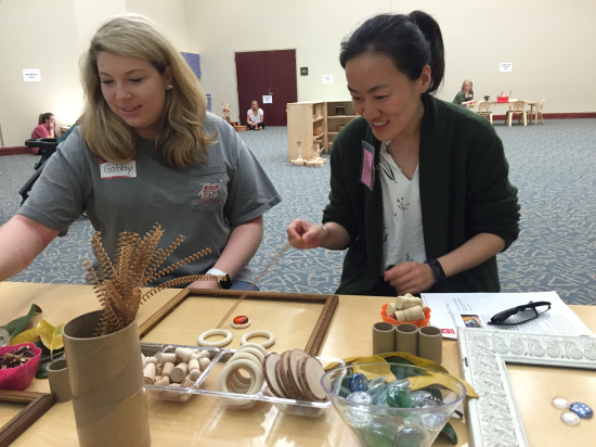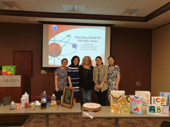 4月13日,阿拉巴马大学儿童发展研究中心专门为访学团教师提供了STEAM教育培训活动。中心的明星培训师Shanna Milligan为访学团四名教师提供了一场覆盖科学、技术、工程、艺术和数学教育的工作坊活动。尽管有老师在两年前就参加过她为本州幼儿教师进行的STEAM培训,可是本次工作坊活动中,所有涉及到的幼儿教育活动几乎都是全新的。访学团老师一进门看到Shanna老师为大家事先布置的活动场地,就深深被感动了——虽然只有4位学员,可她事先还是花了好几个小时准备教具,而工作坊活动结束后,她还得花几个小时整理教具。从Shanna老师那里,访学团教师不仅学到最新的幼儿教育方法、幼儿教育资源、如何将创新的教育理念变为创新的教学方法,更加体会到真正的好老师是什么样的:无私的奉献分享、不计成本的备课、不断的自我更新。