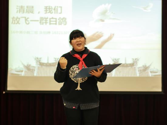 教育学院16中美小教3班朱怡婷颈系红领巾,激情昂扬地带来《清晨,我们放飞一群白鸽》,强调了和平的意义,并将祖国高于一切的信念深深地植入同学们心中。