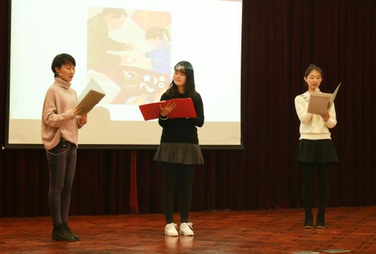 教育学院15学前教育1、2班李春苗、丁昕和路雨桐同学组成的“从前慢”组合,采用角色分工朗读的创新形式,为大家演绎了别具一格的绘本——《团圆》。她们用情至深地向大家展示了过年时家人团聚的温暖点滴,道出了团圆的幸福与分别的不舍。