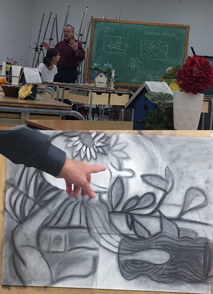 视觉艺术学院教学团队形成以经验丰富的教授副教授为主、充满活力的年轻助理教授为辅的教学梯队,师生比例为1:10,实行小班化教学,一个班级人数最多为12人,最少为6人。因此,教授在班级上有足够多的教学时间一对一辅导每位学生,学生有足够多的机会与教授面对面交流。通过观察,教学质量比较高,学生很受激励,成绩效果显而易见。比如Drawing Fundemental (绘画基础)课程,Crowley教授有超过40年的绘画教学经验,他非常注重学术的抽象思维。在课堂中注重启发性的、创造性的教学,训练学生的创造性思维,充分利用多种绘画媒体、技法、工具等,分析图形美学,解构和重构图形的创作能力,并善于从绘画史的角度出发,把历届大师的作品分析透彻并提炼出教学方法,一对一辅导,哪怕是没有绘画基础的学生,也能从0到1,从无到有,逐渐寻找到美感与技能并重的创意手法,这为今后的图形设计的创作方法作了极好的铺垫。