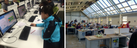 (左图为何燕老师在课堂上参与实验右图为参观艺术设计学院的道具模型教室)