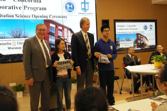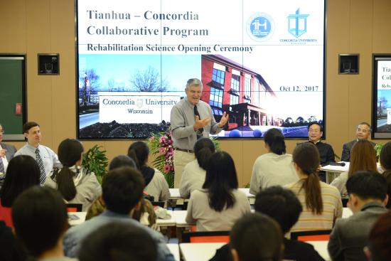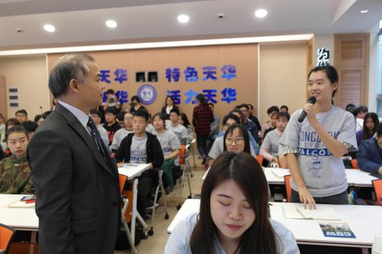 威斯康星协和大学副校长Dr. Cario介绍了威斯康星协和大学发展概况以及专业学习情况,美方学校已经为赴美学生做好充分准备,以热情、友好、协作的态度欢迎同学们的到来。协和国际处主任Dr. Birner详细地介绍了协和大学的国际办学历史,于1965年第一次进入中国,1995年于中国香港办学,现于在上海浦东开办协和国际学校。他们相信,丰富的国际办学经验一定能保证提供较好的教学品质。康复专业主任King博士以亲切、幽默的演讲受到同学们的欢迎。King博士通过提问互动和案例讲解,向同学展示了他在天华美方专业课的课堂教学方法。King博士希望同学们认识到专业所学的知识和将来从事的工作都具备深远的意义和影响,并对同学们的加入表示热烈欢迎。协和亚太地区负责人高老师表示,两校工作人员以真诚、热情、积极的态度,架起了本次合作的桥梁,为同学们提供优质的服务,更希望同学们能够努力打好学业基础,学习好英语,学好中国优秀文化,加强中美文化交流,努力成为第一批有信心、有能力的合作办学的优秀学生。