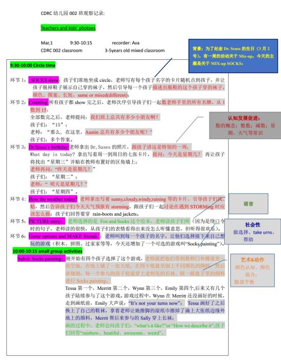 我们对CDRC幼儿园其中一个3-5岁孩子的混龄班进行了截至目前连续7周、每周四个小时的系统观察。这个过程中我们看到了“全人教育”、“教育时机”以及“综合性发展”的理念在幼儿园实践活动中的透彻落实。首先,我们看到这个教室门口挂着的三个牌子:“发展目标”、“本月主题”及“本周活动安排”,其中,“本周活动安排”中的每一项活动均与发展目标中的特定条目一一对应。在我们问及如何对各项活动中孩子的能力发展水平进行评估时,主持带班工作的Virginia Smith老师给我们看了她给每个孩子建立的课堂活动档案,这里有孩子的活动照片、有孩子们认知能力测试的卡片和成绩、她的带班笔记以及她会在课后用于孩子活动表现录入的网上在线评估系统。她说,幼儿园会在每个学期末汇集CDRC的项目专家、教师和孩子家长一起开会,来正式评估每个孩子的发展情况。其次,我们在观察中还发现,这个班常规每天早上9:30到10:00是CIRCLE TIME(起名源于这个活动进行时孩子们和老师是围坐成一个圆的形状),而就在这半个小时中,老师会以围绕一个主题设计一连串的活动和游戏,用来创设情境锻炼孩子们在认知、语言、动作、情绪和社会交往等多方面能力的综合性发展。Virginia老师介绍,对于3-5岁孩子社会情绪能力的培养,她们更多采用渗透式、时机性的引导,比如,教室里会挂上关于“Feeling”的图片,结合主题性活动教孩子进行情绪的命名和识别,也会充分利用类似于两个孩子相互推搡、哭着鼻子来找老师告状这样的自然机会告诉孩子社会交往的规则,教给他们沟通和解决冲突的办法。
