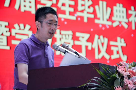 浓浓离别意,深深母校情。来自语言文化学院魏玮作为毕业生代表发言,她也是今年我校34名考上国内外研究生同学的代表。魏玮同学用“坚持”、“奋斗”总结了大学学习和生活,代表全体毕业生表达了对母校的眷恋与感谢、对老师的感激以及对同学情谊的珍惜之情。通识学院聂晓晶老师代表全体教师对同学们的毕业表示了衷心的祝贺,他从其通识教学的大数据统计出发,以“时间”为关键词,追寻大学的梦想,叩问生命意义。聂老师的发言充满深情,博得了一片片掌声。