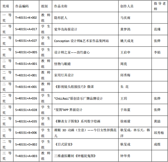 我校艺术设计学院通过“以赛代练,以赛促教”强化专业内涵建设,进行全院动员,精心准备参赛,组织师生参加了9月至11月的比赛,在视觉传达设计、数字影像设计、互动媒体设计、网页设计、环境空间设计等多个参赛类别踊跃参与投稿,最终5位教师获得教师组奖项,14个学生作品分获一、二、三等奖,获奖名次及等级在上海各院校中排名第一。