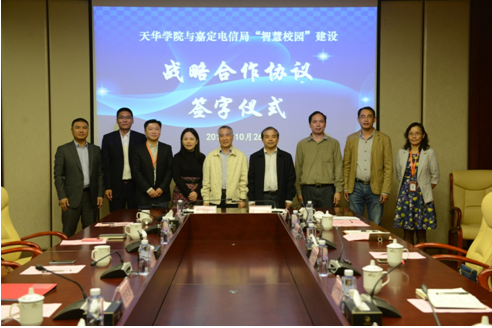 2016年10月26日下午,我校与嘉定电信局“智慧校园”建设战略合作协议签字仪式在同华楼第一会议室举行。出席签字仪式的嘉定电信局领导有党委书记、局长钱名海,副局长吴振华,局长助理代颖,办公室主任张骐,企业文化处处长陈唯,政企客户中心副主任叶豪,嘉定电信局徐行分局局长万伊龙、副局长周健。我校校长叶才福,副校长朱国权,资产设备处处长朱清,党委宣传部长齐砚奎,资产设备处副处长董海霞、周建文,网络中心主任许晓洁出席了签字仪式。签字仪式由资产设备处处长朱清主持。