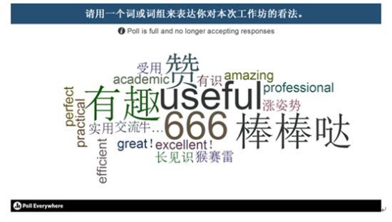活动最后,邢靖文老师用Polleverywhere软件让大家试用一个词或词组表达对本次名师工作坊的看法。新教师们纷纷体验该软件,与邢靖文老师实现线上积极互动。大家一边写下自己对本次活动的看法,屏幕那一边也做同步显示。本次活动新教师表示,邢靖文老师介绍的几种移动学习软件和平台可以在之后的日常教学中,进行适当采用,一方面可以活跃课堂气氛,激发学生学习兴趣;另一方面可以让课堂学习变得更加简单、容易。同时,新教师们也提到了对移动学习软件和平台的使用需要实行一定的监督,以便充分发挥其教育意义。