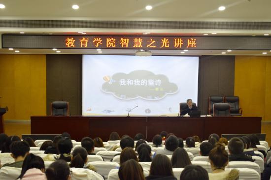 2016年12月13日16点30分,教育学院在晖华楼报告厅举行智慧之光系列讲座,本次讲座主题为《我的童诗和我喜爱的童诗》,特邀中国作家协会会员、上海辞书出版社《中外童话鉴赏辞典》主编、《新诗鉴赏辞典》特约审稿人戴达老师主讲,出席本次讲座的有教育学院院长滕薇老师、校党委书记助理凌琦老师、教育学院党总支副书记华芸老师,以及来自教育学院15、16级的学生们。