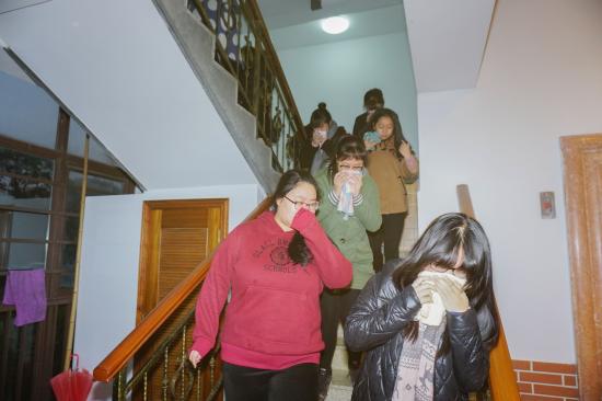 伴随着漫天的浓烟飘起,宿舍楼内消防警报声和消防疏散广播及时响起,同学们听到疏散指令和警报,立即用湿毛巾捂着口鼻,躬腰急行,在保卫干事和消防志愿者的引导下,快速地从各个楼层向安全区域疏散,面对遮天刺鼻的烟雾无所畏惧仍然有序的到达指定位置集合。