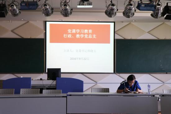 2016年9月22日中午12点,我校行政和教学两个党总支在明华楼五楼演播中心举行“两学一做”学习教育,党委书记韩晓玉为党员同志讲党课。